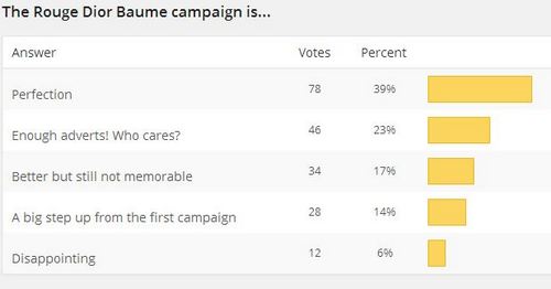 As for the poll about the new (I use “new” loosely, as it seems the photos were probably taken during the original campaign) Rouge Baume campaign photos, it’s clear that fans are getting tired of ONLY having advertising to get their Natalie fix.